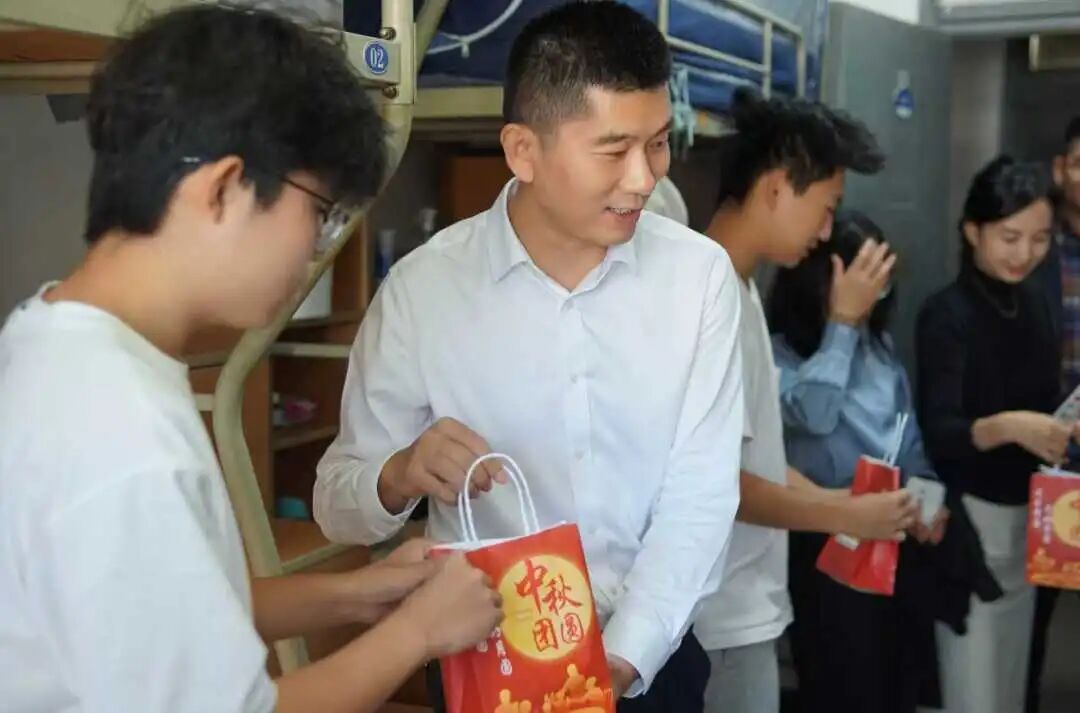 限定月饼递到同学们手中,并与大家亲切交流,细致了解入学后的生活适应情况和学习需求。