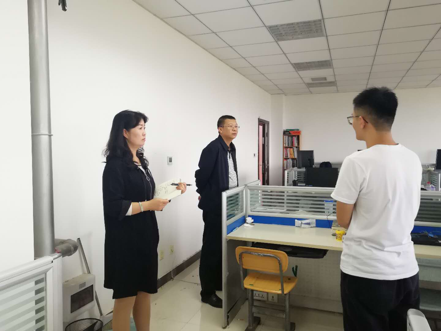 首先,陈书记到各教研室检查中指出存在的安全问题,尤其是安全用电问题,陈洪亮书记边检查边把同学们忘记关闭的电源关掉,并叮嘱各个教研室学生一定要注意用电安全。陈书记指出,同学们尽量不要带食物到教研室和实验室,以防因老鼠引发的出血热等疾病。随后,陈书记还强调安全工作不能有一刻放松,仍需提高警惕,全体师生要牢固树立安全发展理念,提高安全意识,养成良好的安全习惯。特别是十一假期期间,各实验室、教研室等要全员参与,对日常安全工作进行时时处处、全方位、全员排查,要做到防疫情、防火、防盗。王宇英主任对检查出来的安全隐患及时记录,明确专人负责、限时整改,防范于未然,杜绝校园安全事故发生。最后,陈书记代表av解说