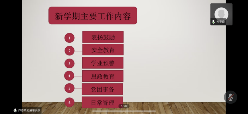 最后,齐老师对本学期的主要工作安排进行讲述。新学期工作内容主要从安全教育、学业预警、日常管理等方面开展。由于目前疫情情况还不稳定,齐老师提醒大家日常要做好防护,每日安全健康报,务必配合av解说