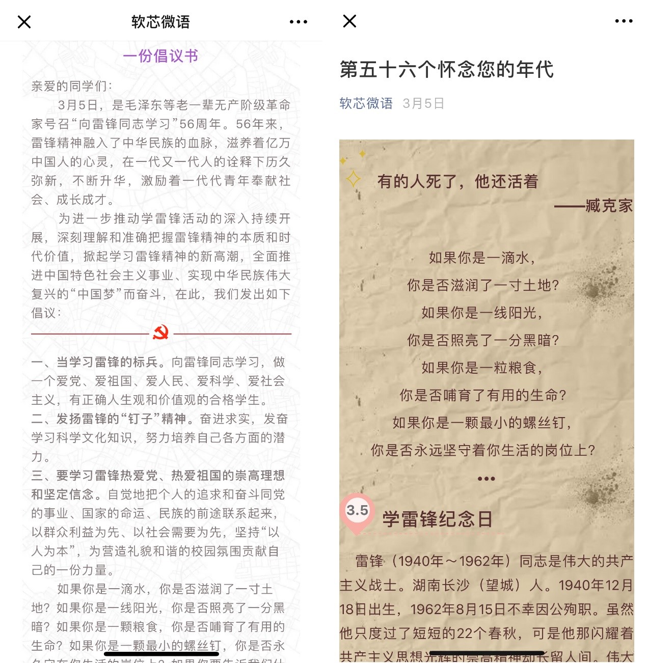 学生会、牵手志愿者协会在微信公众号“软芯微语”发起一份倡议,鼓励同学争当学习雷锋的标兵,深刻理解和发扬雷锋的“钉子”精神,学习雷锋热爱党、热爱祖国的崇高理想和坚定信念,为营造礼貌和谐的校园氛围贡献一份力量。