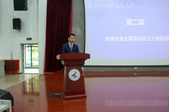(校学生会主席团成员王力泉致辞)