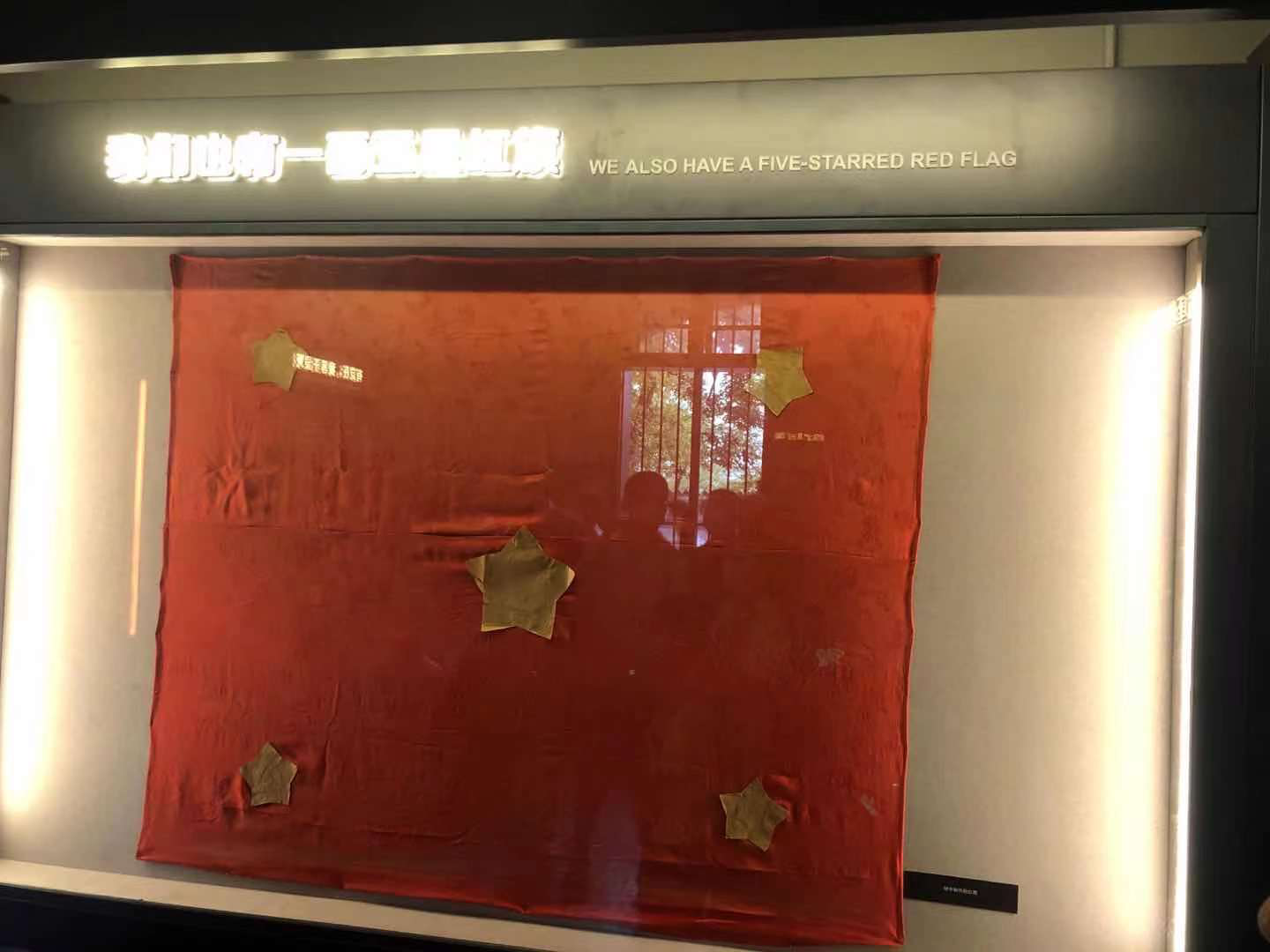 在平二室牢房的墙壁正中央还悬挂着一面不一样的五星红旗:一面还有印花的红布上在四角与正中间的位置绣上了五颗金星,这面红旗背后的故事是:1949年10月1日,毛泽东主席在天安门城楼上升起第一面五星红旗,向全世界宣告中华人民共和国成立这一特大喜讯被革命先烈们知晓后,平二室的罗广斌、陈然等同志当即自制了一面五星红旗。红旗做好后,被藏于地板下。重庆解放后,在大屠杀中脱险的罗广斌回到牢房,取出了这面红旗。