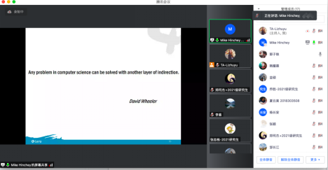邀请,爱尔兰利默里克大学的软件工程教授Mike Hinchey为我校学生在线上开展了“Evolving Critical Systems/任务关键软件系统演化”课程。这门课程涉及到软件工程领域中软件系统的发展历史以及演化方式,参与到该线上课程的学生有来自av解说