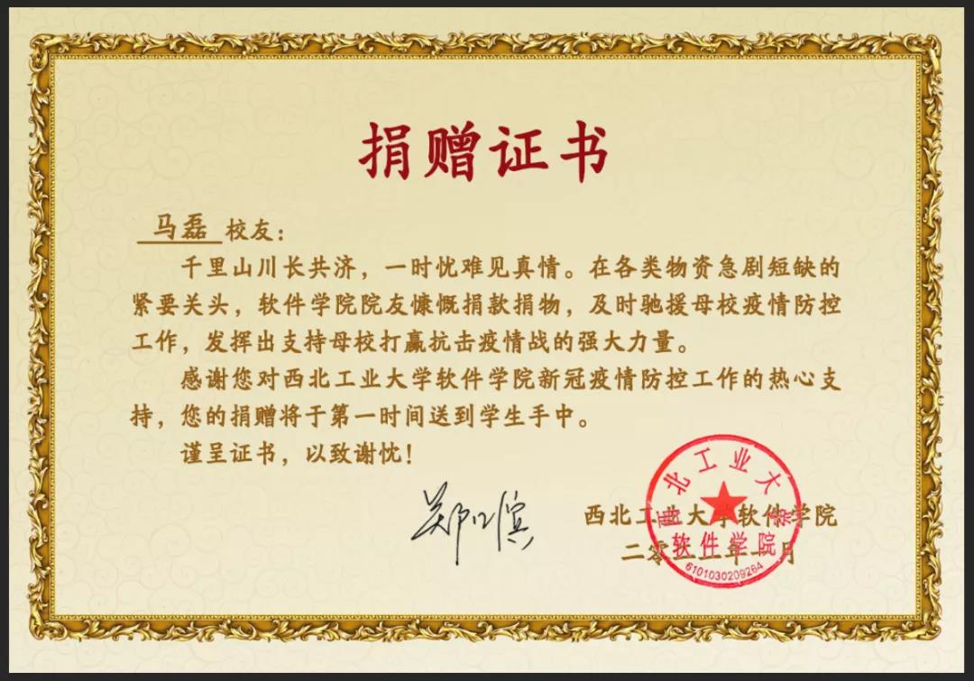 为捐赠物资的马磊等校友赠与捐赠证书)