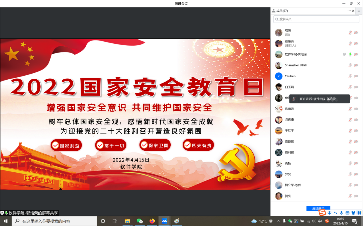 组织全体教职工在线参观了《台儿庄国家安全教育馆》,观看了《2022国家安全宣传片》和《国家安全保密宣传教育视频》,动员教职工参加了“中国普法微信公众号”上的国家安全教育日有奖知识竞答活动。