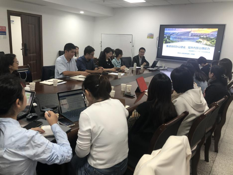 张雯鑫作了题为《推进协同办公建设,提升内部治理能力》的交流,对OA系统建设现状、新版OA系统、OA公共账号操作指南展开介绍,同时对OA操作程序做了示范,表明OA系统的建设和运用是大学现代化治理能力的重要体现,OA系统集办文办事办会为一体,是让师生少跑腿,资源都共享,流程更便捷的具体抓手。张老师的培训和分享使全员职工对OA系统的使用有了更深的了解,加强OA的日常使用,将有效促进av解说