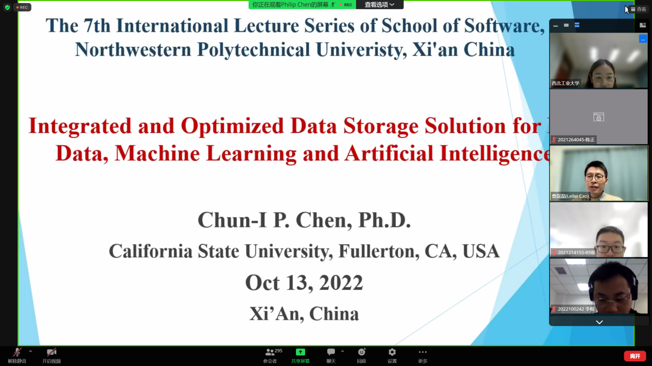 第一场讲座是由Chun-I Philip Chen教授带来的题为《Integrated and Optimized Data Storage Solution for Big Data, Machine Learning and Artificial Intelligence》的讲座。Chun-I Philip Chen教授自2012年起担任计算机科学系兼职教授。在本次讲座中,他用他独特的方式向我们分享了面向大数据、机器学习和人工智能的集成优化数据存储解决方案,首先提出大数据处理、分享、管理和存储困难的问题,然后分别介绍了大数据分析、机器学习和人工智能应用过程的独特功能,通过对它们每一个处理阶段的介绍,让同学们更加轻松地识别与大数据、机器学习和人工智能应用相关的数据存储需求。最后提出了考虑使用集成数据存储体系结构的优化数据存储创建有效的存储管理系统。