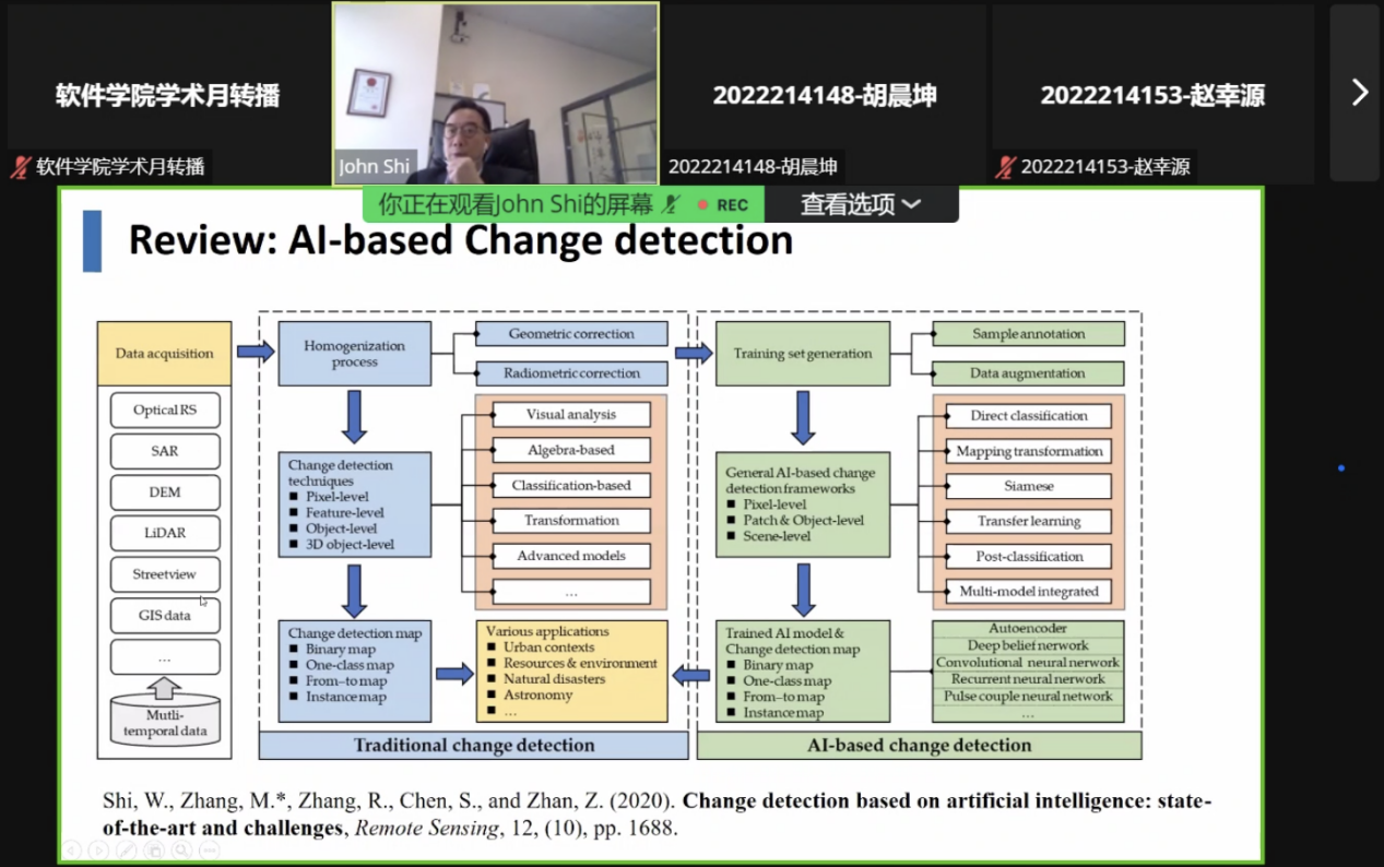 第一场讲座题为《AI for object recognition and change detection from satellite images》,史文中教授分享了面向图像识别、深度学习和人工智能等前沿领域技术,还分享了他们课题组的一些成果。首先,他提出大数据处理、分享、管理和存储中存在的问题,然后分别介绍了大数据分析、机器学习和人工智能应用过程的独特功能,通过对它们每一个处理阶段的介绍,让同学们更加轻松地识别与大数据、机器学习和人工智能应用相关的数据存储需求。最后,他提出了一种考虑使用集成数据存储体系结构的优化数据存储创建有效的存储管理系统。