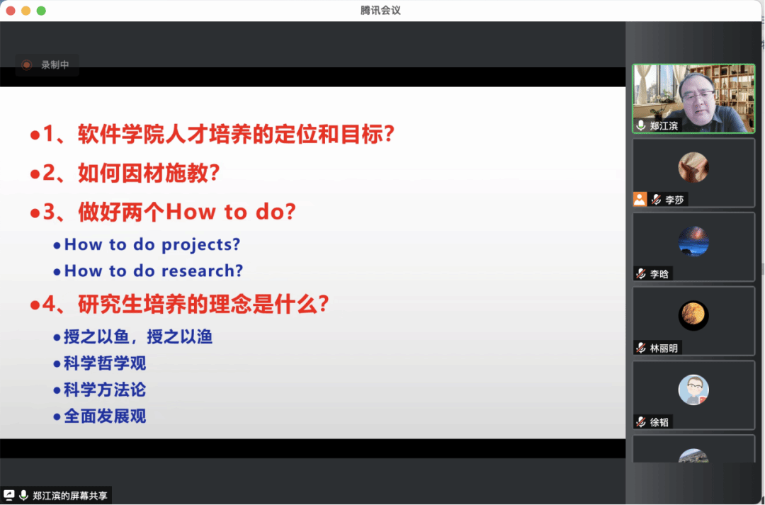 的人才培养定位和目标,郑江滨总结,导师应了解学生的知识体系和天资,因材施教,挖掘其潜能;导师应该教会学生如何做项目、如何做研究,关注学生实践能力的培养;导师更应该关注学生身体健康,引导学生德智体美劳全面发展;同时关注学生“面向生活、面向困难”情商的培养。最后,郑江滨引导导师“授之以鱼,授之以渔”,结合科学哲学观、科学方法论及全面发展观等研究生培养理念培养人才,使之全面发展。